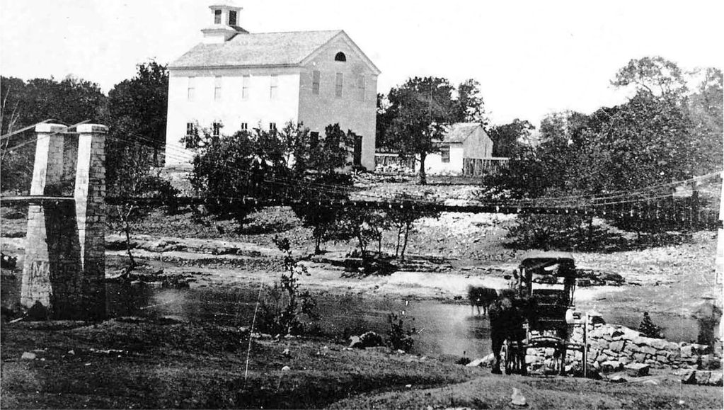 Salado Baptist Church and suspension bridge on Salado Creek